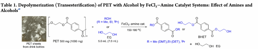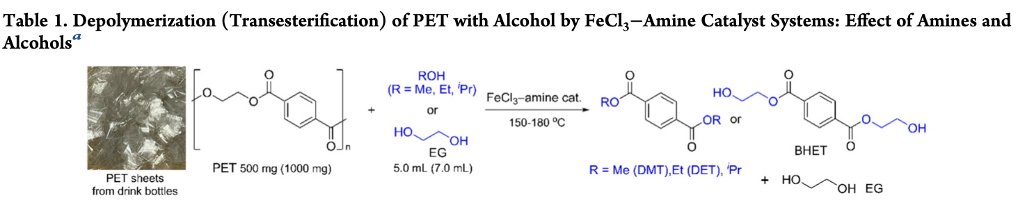 For the quantitative chemical conversions of PET pellets, bottle waste, and textile waste, transesterification was done with alcohols using FeCl3−amine catalyst systems. The activity increased by adding small amounts of amine (benzimidazole). The scaleup reactions also afforded corresponding analytically pure terephthalates [e.g. dimethyl terephthalate (DMT) as white crystalline materials].