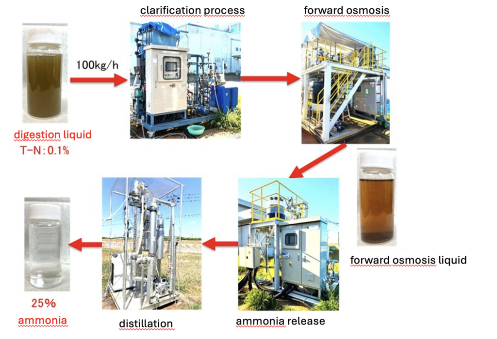 Under a NEDO grant, Kimura Chemical Machinery Co., Kobe University, Novels Co., and FT Biopower Co. have developed Japan’s first energy-saving process for recovering ammonia from methane fermentation digestate. They have used a combination of a forward osmosis membrane in combination with heat pump distillation technology and slaked lime.